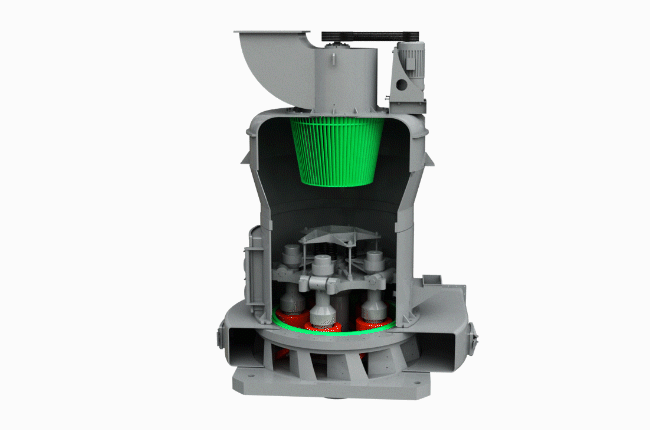 大塊石料在破碎機充分破碎后,由斗式提升機送至儲料斗,之后由電磁振動(dòng)給料機有序送至主機內研磨。主機內懸掛于梅花架上的磨輥裝置繞中心軸旋轉,磨輥同時(shí)繞磨輥軸自轉,在離心力的作用下,磨輥向外擺壓緊磨環(huán),旋轉的鏟刀鏟起的物料被拋向輥環(huán)之間,因磨輥的滾碾以達到粉碎和研磨作用。磨碎室的粉末被鼓風(fēng)機的氣流吹到主機上方的分析機進(jìn)行分析,細度過(guò)粗的石粉由于自重則落入主機內重磨,合格細粉則隨風(fēng)流進(jìn)入到大旋風(fēng)收集器,收集后經(jīng)出料管排出即為成品。