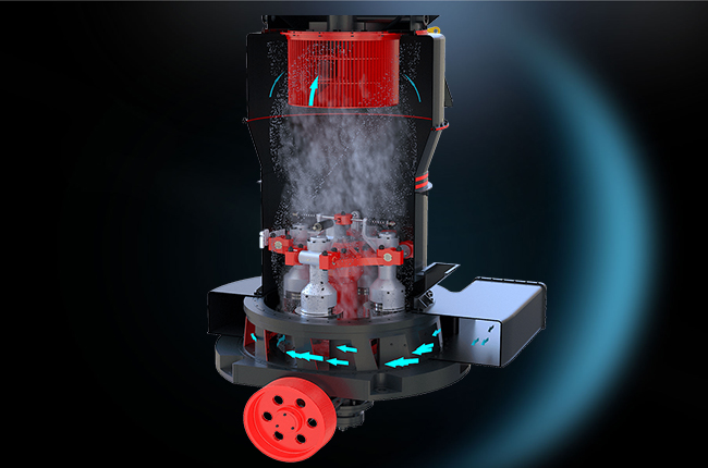 該機結構主要由主機、分析器、風(fēng)機、成品旋風(fēng)分離器、微粉旋風(fēng)分離器及風(fēng)管組成。其中,主機由機架、進(jìn)風(fēng)蝸殼、鏟刀、磨輥、磨環(huán)、罩殼組成。雷蒙機工作時(shí),將需要粉碎的物料從機罩殼側面的進(jìn)料斗加入機內,依靠懸掛在主機梅花架上的磨輥裝置,繞著(zhù)垂直軸線(xiàn)公轉,同時(shí)本身自轉,由于旋轉時(shí)離心力的作用,磨輥向外擺動(dòng),緊壓于磨環(huán),使鏟刀鏟起物料送到磨輥與磨環(huán)之間,因磨輥的滾動(dòng)碾壓而達到粉碎物料的目的。
